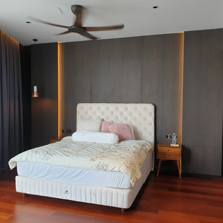 Bedroom: A Serene Retreat The bedroom is designed as a peaceful sanctuary, prioritizing comfort and simplicity. A textured feature wall in dark wood paneling adds depth to the space, while soft, indirect lighting creates a warm and inviting atmosphere. The tufted upholstered bed with neutral bedding serves as the centerpiece, combining softness with structure.