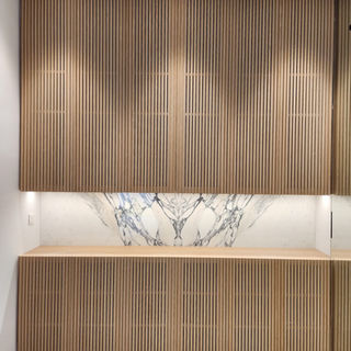 The resulting home is a testament to this partnership. It exudes a harmonious blend of modern minimalism and functional luxury. Clean lines and thoughtful detailing define the living spaces, where natural wood accents and striking marble create warm focal points. Sleek, full-height cabinetry and built-in shelving provide ample, discreet storage, enhancing the streamlined aesthetic. The kitchen merges high-gloss finishes and state-of-the-art appliances with practical utility spaces, ensuring every detail is optimized for both efficiency and enduring style.