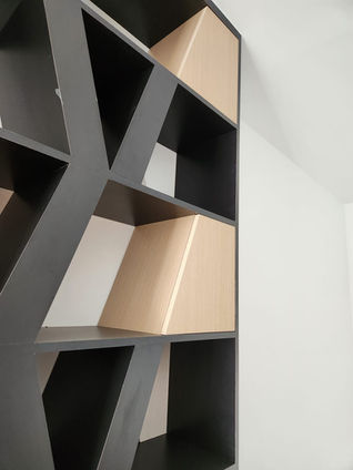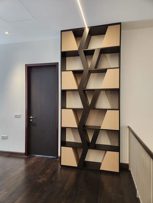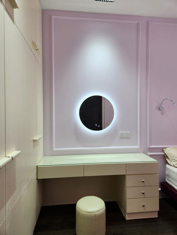 The bedrooms radiate comfort and individuality, each with its unique touch of elegance. Richly textured feature walls, complemented by soft drapery and warm lighting, create a serene ambiance. Pops of color, such as deep navy or pastel lilac, add character to the otherwise neutral palette, while bespoke furnishings like custom wardrobes and vanity units enhance both aesthetics and functionality. The study area, with its illuminated display shelves and rustic wood countertops, offers a workspace that feels warm and inspiring.